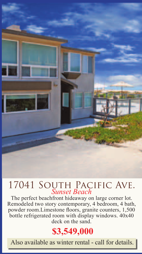 17041 South Pacific Ave. Sunset Beach The perfect beachfront hideaway on large corner lot. Remodeled two story contemporary, 4 bedroom, 4 bath, powder room.Limestone floors, granite counters, 1,500 bottle refrigerated room with display windows. 40x40 deck on the sand. $3,549,000 Also available as winter rental - call for details.