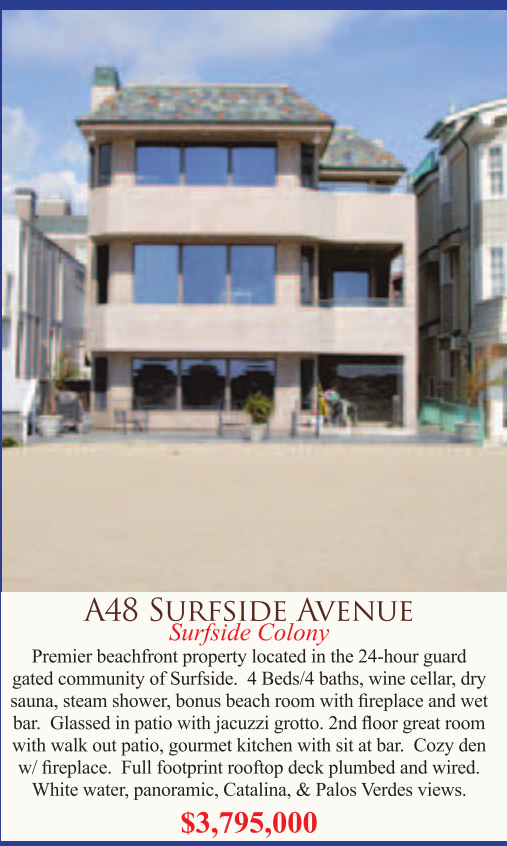 Premier beachfront property located in the 24-hour guard gated community of Surfside. 4 Beds/4 baths, wine cellar, dry sauna, steam shower, bonus beach room with fireplace and wet bar. Glassed in patio with jacuzzi grotto. 2nd floor great room with walk out patio, gourmet kitchen with sit at bar. Cozy den w/ fireplace. Full footprint rooftop deck plumbed and wired.