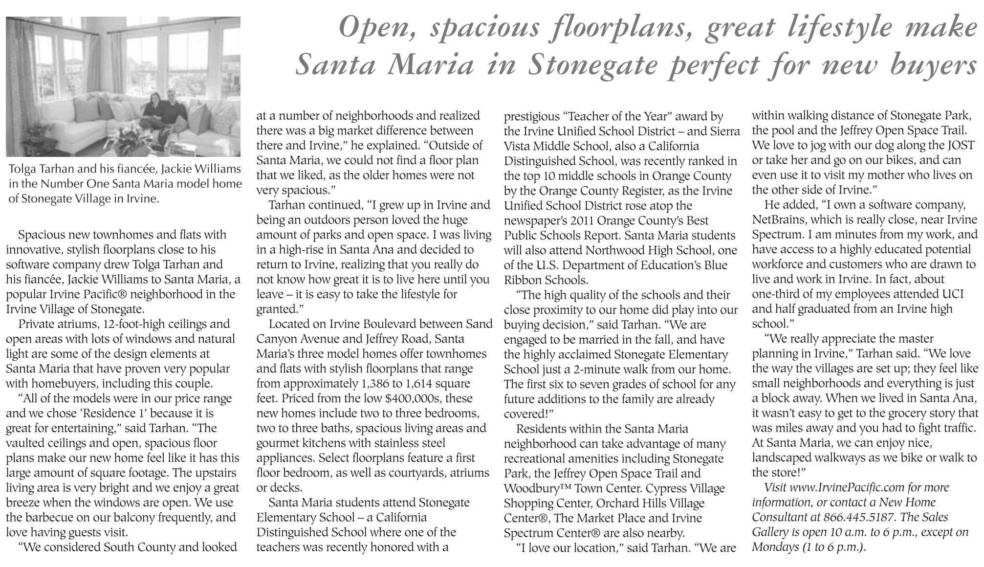 “We really appreciate the master planning in Irvine,” Tarhan said. “We love the way the villages are set up; they feel like small neighborhoods and everything is just a block away. When we lived in Santa Ana, it wasn’t easy to get to the grocery story that was miles away and you had to fight traffic. At Santa Maria, we can enjoy nice, landscaped walkways as we bike or walk to the store!” Visit www.IrvinePacific.com for more information, or contact a New Home Consultant at 866.445.5187. The Sales Gallery is open 10 a.m. to 6 p.m., except on Mondays (1 to 6 p.m.).