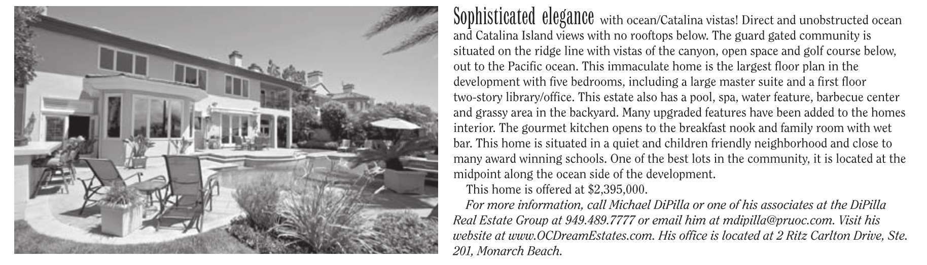 This home is offered at $2,395,000. For more information, call Michael DiPilla or one of his associates at the DiPilla Real Estate Group at 949.489.7777 or email him at mdipilla@pruoc.com. Visit his website at www.OCDreamEstates.com. His office is located at 2 Ritz Carlton Drive, Ste. 201, Monarch Beach.