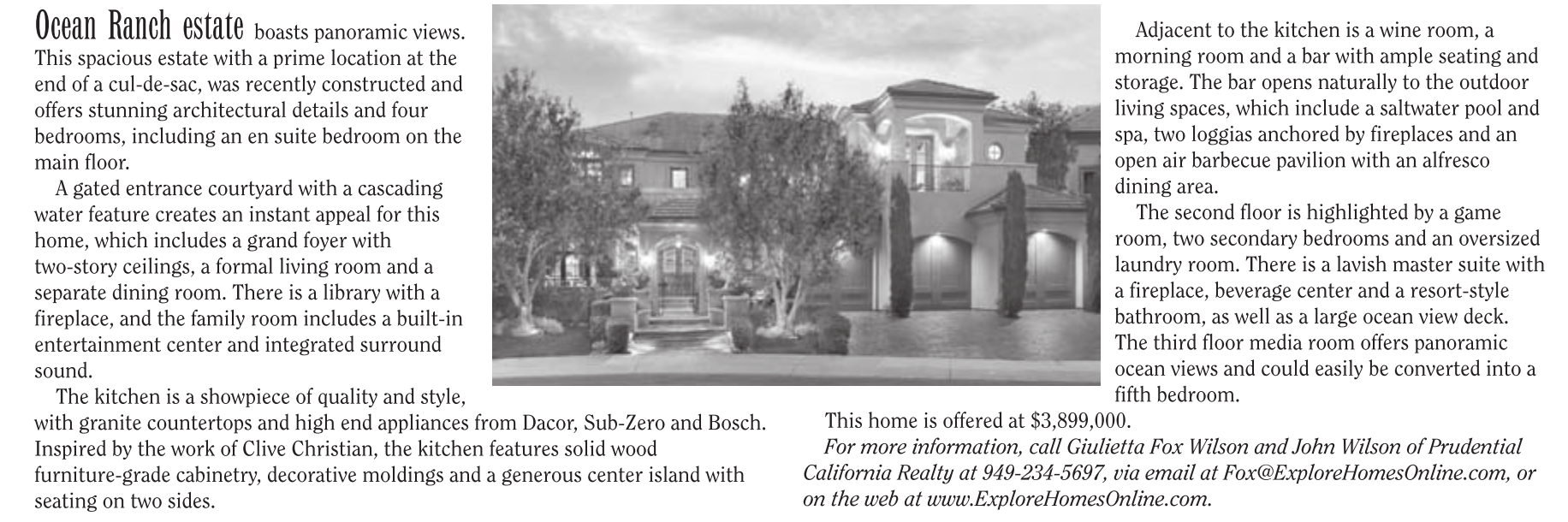 This home is offered at $3,899,000. For more information, call Giulietta Fox Wilson and John Wilson of Prudential California Realty at 949-234-5697, via email at Fox@ExploreHomesOnline.com, or on the web at www.ExploreHomesOnline.com.
