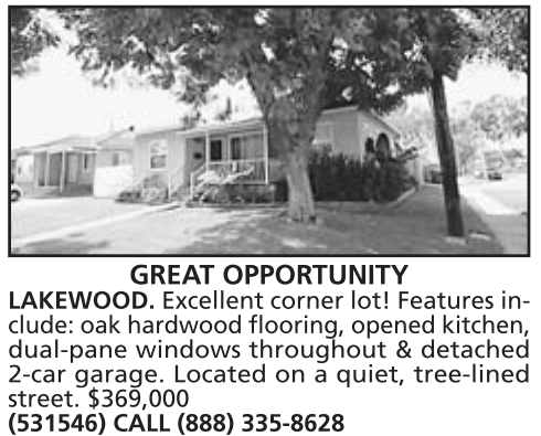GREAT OPPORTUNITY LAKEWOOD. Excellent corner lot! Features include: oak hardwood flooring, opened kitchen, dual-pane windows throughout & detached 2-car garage. Located on a quiet, tree-lined street. $369,000 (531546) CALL (888) 335-8628