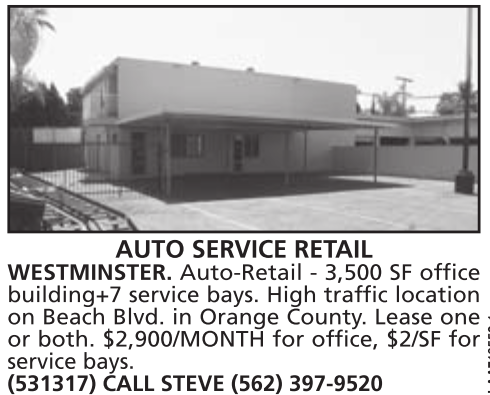 or both. $2,900/MONTH for office, $2/SF for service bays. (531317) CALL STEVE (562) 397-9520