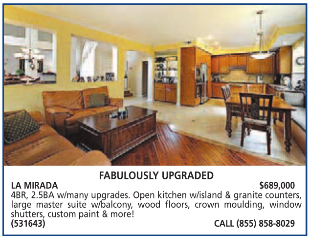 FABULOUSLY UPGRADED LA MIRADA $689,000 4BR, 2.5BA w/many upgrades. Open kitchen w/island & granite counters, large master suite w/balcony, wood floors, crown moulding, window shutters, custom paint & more! (531643) CALL (855) 858-8029