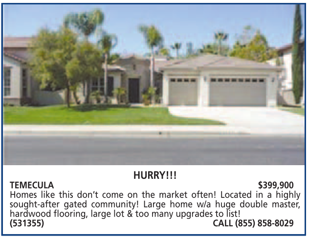 TEMECULA $399,900 Homes like this don’t come on the market often! Located in a highly sought-after gated community! Large home w/a huge double master, hardwood flooring, large lot & too many upgrades to list! (531355) CALL (855) 858-8029