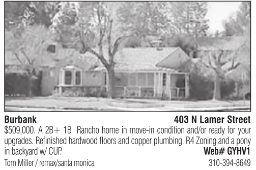 Tom Miller / remax/santa monica 310-394-8649 Burbank 403 N Lamer Street $509,000. A 2B+ 1B Rancho home in move-in condition and/or ready for your upgrades. Refinished hardwood floors and copper plumbing. R4 Zoning and a pony in backyard w/ CUP. Web# GYHV1