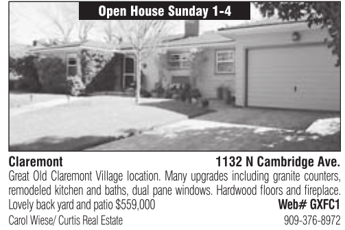 Claremont 1132 N Cambridge Ave. Great Old Claremont Village location. Many upgrades including granite counters, remodeled kitchen and baths, dual pane windows. Hardwood floors and fireplace. Lovely back yard and patio $559,000 Web# GXFC1 Open House Sunday 1-4 Carol Wiese/ Curtis Real Estate 909-376-8972