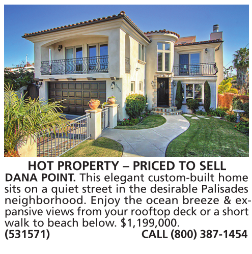 HOT PROPERTY – PRICED TO SELL DANA POINT. This elegant custom-built home sits on a quiet street in the desirable Palisades neighborhood. Enjoy the ocean breeze & expansive views from your rooftop deck or a short walk to beach below. $1,199,000. (531571) CALL (800) 387-1454