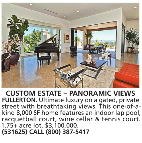 CUSTOM ESTATE – PANORAMIC VIEWS FULLERTON. Ultimate luxury on a gated, private street with breathtaking views. This one-of-akind 8,000 SF home features an indoor lap pool, racquetball court, wine cellar & tennis court. 1.75+ acre lot. $3,100,000. (531625) CALL (800) 387-5417