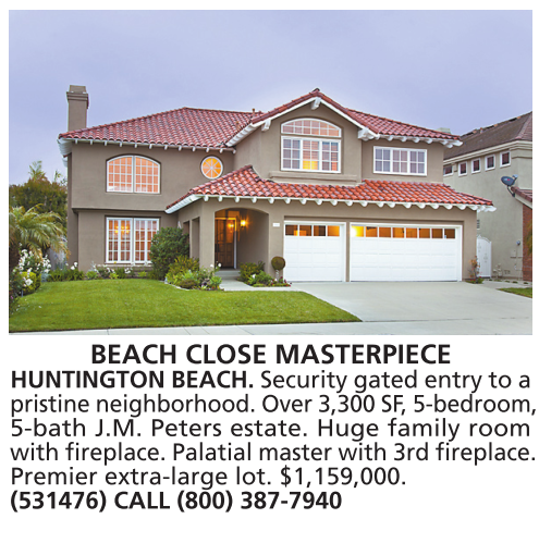 BEACH CLOSE MASTERPIECE HUNTINGTON BEACH. Security gated entry to a pristine neighborhood. Over 3,300 SF, 5-bedroom, 5-bath J.M. Peters estate. Huge family room with fireplace. Palatial master with 3rd fireplace. Premier extra-large lot. $1,159,000. (531476) CALL (800) 387-7940