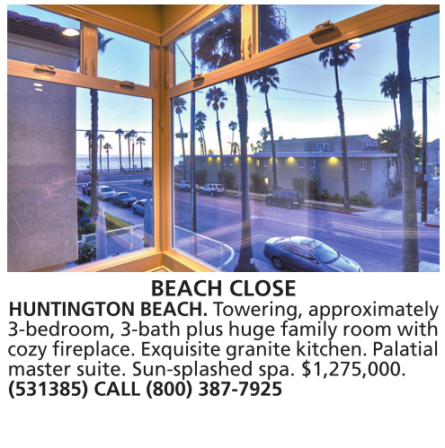 BEACH CLOSE HUNTINGTON BEACH. Towering, approximately 3-bedroom, 3-bath plus huge family room with cozy fireplace. Exquisite granite kitchen. Palatial master suite. Sun-splashed spa. $1,275,000. (531385) CALL (800) 387-7925