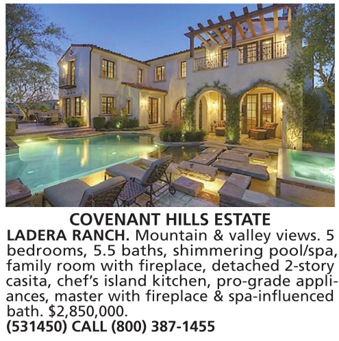 COVENANT HILLS ESTATE LADERA RANCH. Mountain & valley views. 5 bedrooms, 5.5 baths, shimmering pool/spa, family room with fireplace, detached 2-story casita, chef’s island kitchen, pro-grade appliances, master with fireplace & spa-influenced bath. $2,850,000. (531450) CALL (800) 387-1455