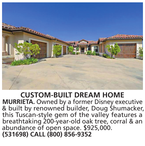 CUSTOM-BUILT DREAM HOME MURRIETA. Owned by a former Disney executive & built by renowned builder, Doug Shumacker, this Tuscan-style gem of the valley features a breathtaking 200-year-old oak tree, corral & an abundance of open space. $925,000. (531698) CALL (800) 856-9352