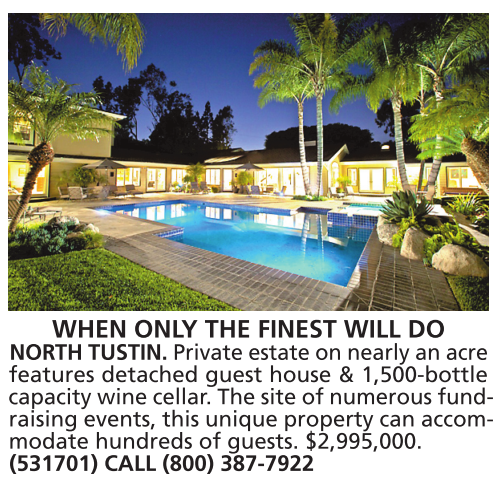 WHEN ONLY THE FINEST WILL DO NORTH TUSTIN. Private estate on nearly an acre features detached guest house & 1,500-bottle capacity wine cellar. The site of numerous fundraising events, this unique property can accommodate hundreds of guests. $2,995,000. (531701) CALL (800) 387-7922