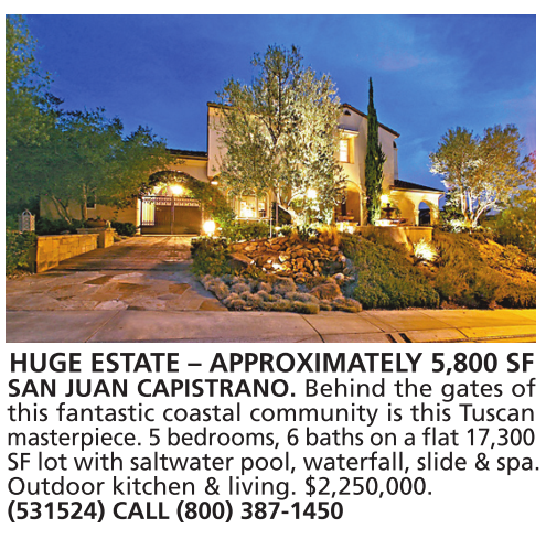 HUGE ESTATE – APPROXIMATELY 5,800 SF SAN JUAN CAPISTRANO. Behind the gates of this fantastic coastal community is this Tuscan masterpiece. 5 bedrooms, 6 baths on a flat 17,300 SF lot with saltwater pool, waterfall, slide & spa. Outdoor kitchen & living. $2,250,000. (531524) CALL (800) 387-1450