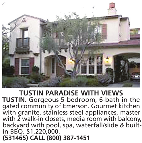 TUSTIN PARADISE WITH VIEWS TUSTIN. Gorgeous 5-bedroom, 6-bath in the gated community of Emerson. Gourmet kitchen with granite, stainless steel appliances, master with 2 walk-in closets, media room with balcony, backyard with pool, spa, waterfall/slide & builtin BBQ. $1,220,000. (531465) CALL (800) 387-1451