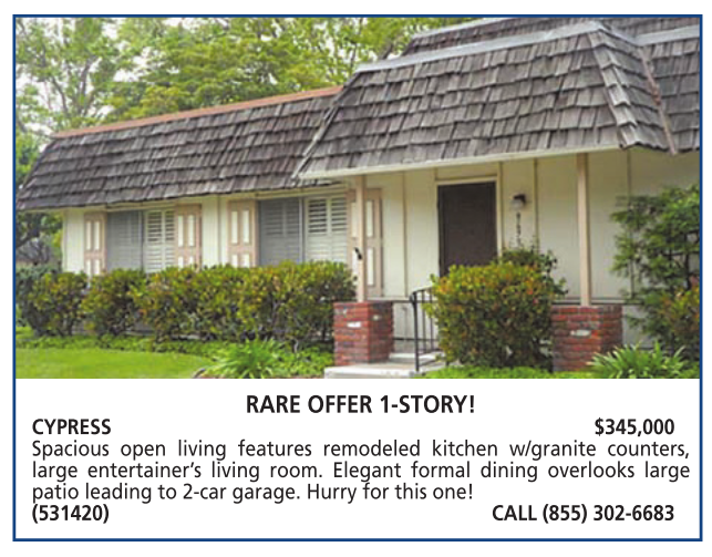 RARE OFFER 1-STORY! CYPRESS $345,000 Spacious open living features remodeled kitchen w/granite counters, large entertainer’s living room. Elegant formal dining overlooks large patio leading to 2-car garage. Hurry for this one! (531420) CALL (855) 302-6683
