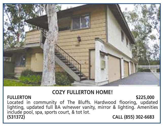 FULLERTON $225,000 Located in community of The Bluffs. Hardwood flooring, updated lighting, updated full BA w/newer vanity, mirror & lighting. Amenities include pool, spa, sports court, & tot lot. (531372) CALL (855) 302-6683