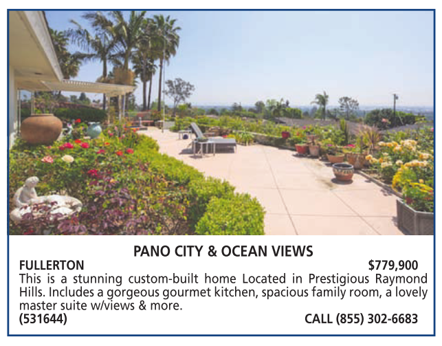 PANO CITY & OCEAN VIEWS FULLERTON $779,900 This is a stunning custom-built home Located in Prestigious Raymond Hills. Includes a gorgeous gourmet kitchen, spacious family room, a lovely master suite w/views & more. (531644) CALL (855) 302-6683