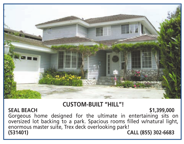 CUSTOM-BUILT “HILL”! SEAL BEACH $1,399,000 Gorgeous home designed for the ultimate in entertaining sits on oversized lot backing to a park. Spacious rooms filled w/natural light, enormous master suite, Trex deck overlooking park! (531401) CALL (855) 302-6683