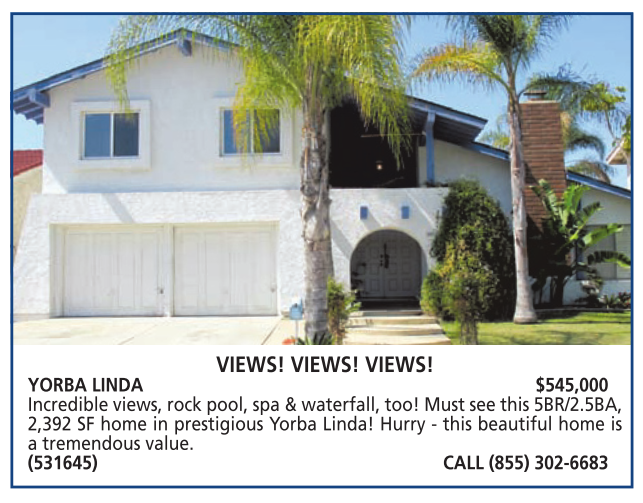 YORBA LINDA $545,000 Incredible views, rock pool, spa & waterfall, too! Must see this 5BR/2.5BA, 2,392 SF home in prestigious Yorba Linda! Hurry - this beautiful home is a tremendous value. (531645) CALL (855) 302-6683
