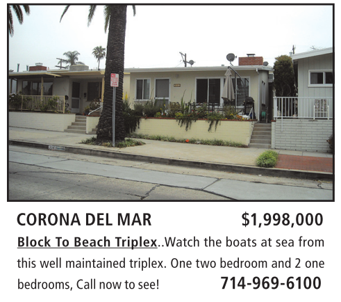 CORONA DEL MAR $1,998,000 Block To Beach Triplex..Watch the boats at sea from this well maintained triplex. One two bedroom and 2 one bedrooms, Call now to see! 714-969-6100