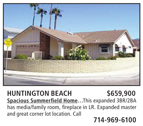 HUNTINGTON BEACH $659,900 Spacious Summerfield Home…This expanded 3BR/2BA has media/family room, fi replace in LR. Expanded master and great corner lot location. Call 714-969-6100