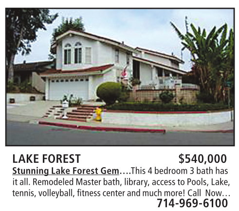 LAKE FOREST $540,000 Stunning Lake Forest Gem….This 4 bedroom 3 bath has it all. Remodeled Master bath, library, access to Pools, Lake, tennis, volleyball, fitness center and much more! Call Now… 714-969-6100