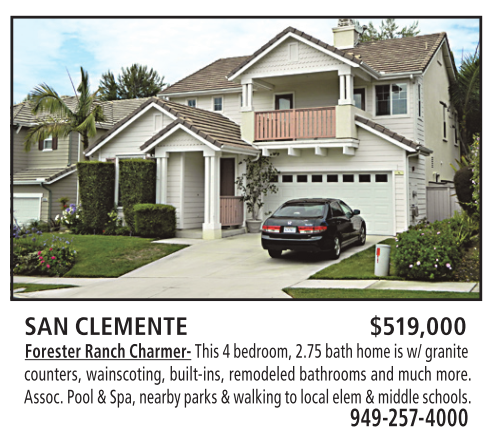 SAN CLEMENTE $519,000 Forester Ranch Charmer- This 4 bedroom, 2.75 bath home is w/ granite counters, wainscoting, built-ins, remodeled bathrooms and much more. Assoc. Pool & Spa, nearby parks & walking to local elem & middle schools.
