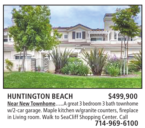 HUNTINGTON BEACH $499,900 Near New Townhome…..A great 3 bedroom 3 bath townhome w/2-car garage. Maple kitchen w/granite counters, fireplace in Living room. Walk to SeaCliff Shopping Center. Call 714-969-6100
