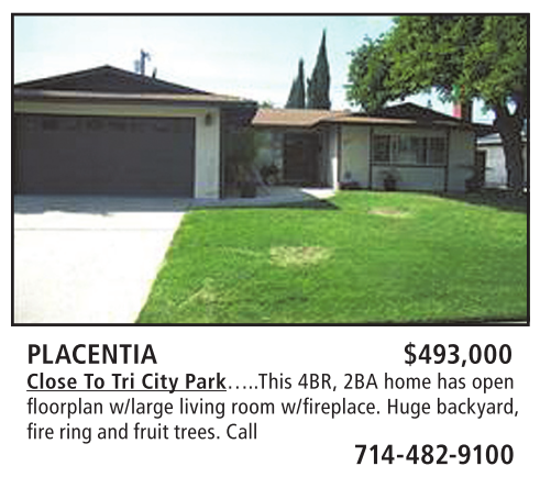 PLACENTIA $493,000 Close To Tri City Park…..This 4BR, 2BA home has open fl oorplan w/large living room w/fi replace. Huge backyard, fire ring and fruit trees. Call 714-482-9100