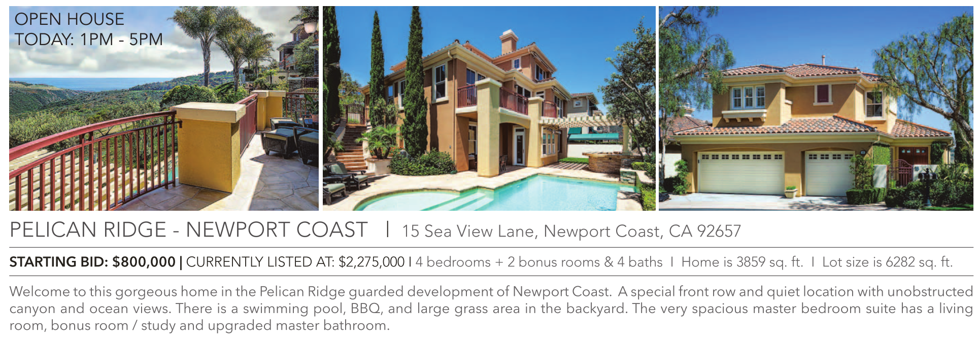 OPEN HOUSE TODAY: 1PM - 5PM PELICAN RIDGE - NEWPORT COAST | 15 Sea View Lane, Newport Coast, CA 92657 STARTING BID: $800,000 | CURRENTLY LISTED AT: $2,275,000 I 4 bedrooms + 2 bonus rooms & 4 baths I Home is 3859 sq. ft. I Lot size is 6282 sq. ft. Welcome to this gorgeous home in the Pelican Ridge guarded development of Newport Coast. A special front row and quiet location with unobstructed canyon and ocean views. There is a swimming pool, BBQ, and large grass area in the backyard. The very spacious master bedroom suite has a living room, bonus room / study and upgraded master bathroom.