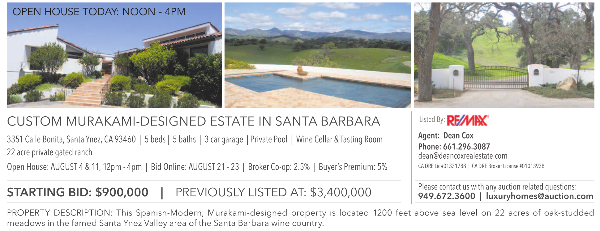 OPEN HOUSE TODAY: NOON - 4PM CUSTOM MURAKAMI-DESIGNED ESTATE IN SANTA BARBARA 3351 Calle Bonita, Santa Ynez, CA 93460 | 5 beds | 5 baths | 3 car garage | Private Pool | Wine Cellar & Tasting Room 22 acre private gated ranch Open House: AUGUST 4 & 11, 12pm - 4pm | Bid Online: AUGUST 21 - 23 | Broker Co-op: 2.5% | Buyer’s Premium: 5% Listed By: Agent: Dean Cox Phone: 661.296.3087 dean@deancoxrealestate.com CA DRE Lic #01331788 | CA DRE Broker License #01013938 STARTING BID: $900,000 | PREVIOUSLY LISTED AT: $3,400,000 Please contact us with any auction related questions: 949.672.3600 | luxuryhomes@auction.com PROPERTY DESCRIPTION: This Spanish-Modern, Murakami-designed property is located 1200 feet above sea level on 22 acres of oak-studded meadows in the famed Santa Ynez Valley area of the Santa Barbara wine country. See also