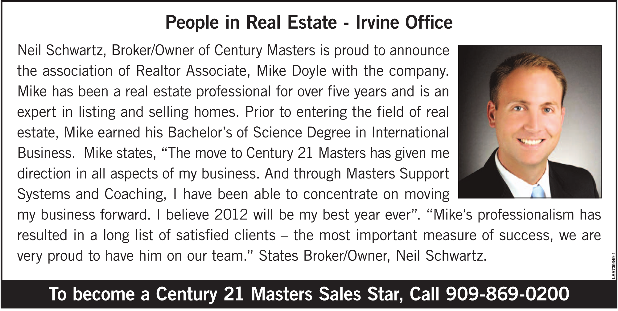 People in Real Estate - Irvine Office Neil Schwartz, Broker/Owner of Century Masters is proud to announce the association of Realtor Associate, Mike Doyle with the company. Mike has been a real estate professional for over five years and is an expert in listing and selling homes. Prior to entering the field of real estate, Mike earned his Bachelor’s of Science Degree in International Business. Mike states, “The move to Century 21 Masters has given me direction in all aspects of my business. And through Masters Support Systems and Coaching, I have been able to concentrate on moving my business forward. I believe 2012 will be my best year ever”. “Mike’s professionalism has resulted in a long list of satisfied clients – the most important measure of success, we are very proud to have him on our team.” States Broker/Owner, Neil Schwartz. To become a Century 21 Masters Sales Star, Call 909-869-0200