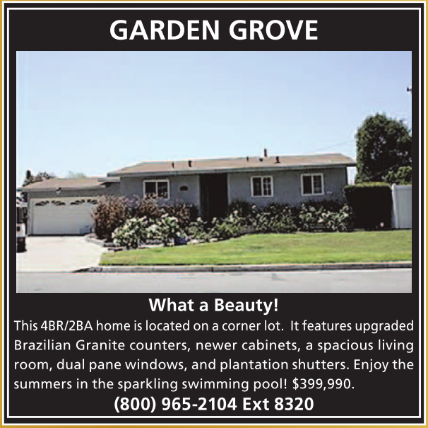 GARDEN GROVE What a Beauty! This 4BR/2BA home is located on a corner lot. It features upgraded Brazilian Granite counters, newer cabinets, a spacious living room, dual pane windows, and plantation shutters. Enjoy the summers in the sparkling swimming pool! $399,990. (800) 965-2104 Ext 8320
