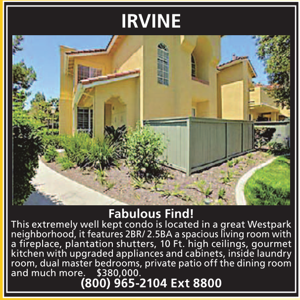 IRVINE Fabulous Find! This extremely well kept condo is located in a great Westpark neighborhood, it features 2BR/ 2.5BA a spacious living room with a fireplace, plantation shutters, 10 Ft. high ceilings, gourmet kitchen with upgraded appliances and cabinets, inside laundry room, dual master bedrooms, private patio off the dining room and much more. $380,000. (800) 965-2104 Ext 8800
