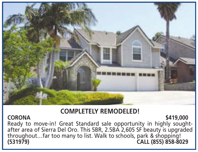 COMPLETELY REMODELED! CORONA $419,000 Ready to move-in! Great Standard sale opportunity in highly soughtafter area of Sierra Del Oro. This 5BR, 2.5BA 2,605 SF beauty is upgraded throughout…far too many to list. Walk to schools, park & shopping! (531979) CALL (855) 858-8029