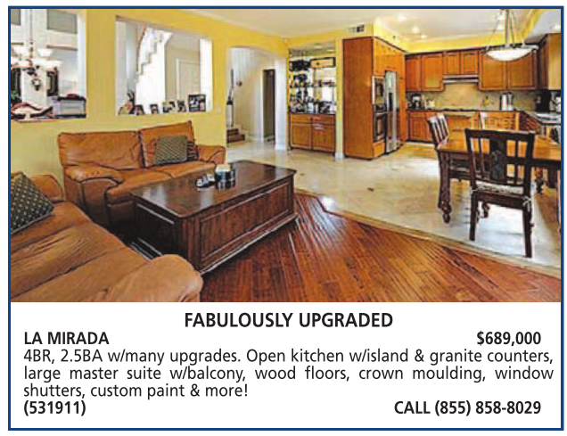 FABULOUSLY UPGRADED LA MIRADA $689,000 4BR, 2.5BA w/many upgrades. Open kitchen w/island & granite counters, large master suite w/balcony, wood floors, crown moulding, window shutters, custom paint & more! (531911) CALL (855) 858-8029