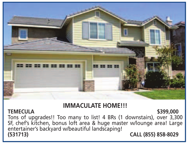 TEMECULA $399,000 Tons of upgrades!! Too many to list! 4 BRs (1 downstairs), over 3,300 SF, chef’s kitchen, bonus loft area & huge master w/lounge area! Large entertainer’s backyard w/beautiful landscaping! (531713) CALL (855) 858-8029