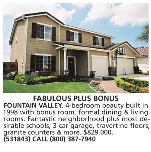 FABULOUS PLUS BONUS FOUNTAIN VALLEY. 4-bedroom beauty built in 1998 with bonus room, formal dining & living rooms. Fantastic neighborhood plus most desirable schools, 3-car garage, travertine floors, granite counters & more. $829,000. (531843) CALL (800) 387-7940
