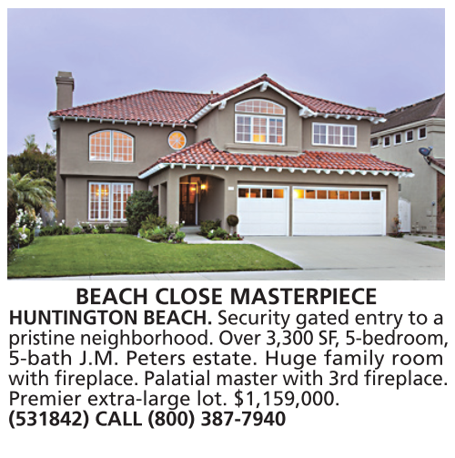 BEACH CLOSE MASTERPIECE HUNTINGTON BEACH. Security gated entry to a pristine neighborhood. Over 3,300 SF, 5-bedroom, 5-bath J.M. Peters estate. Huge family room with fireplace. Palatial master with 3rd fireplace. Premier extra-large lot. $1,159,000. (531842) CALL (800) 387-7940