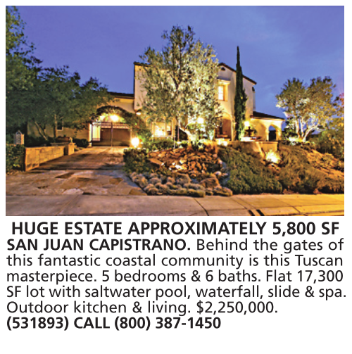 HUGE ESTATE APPROXIMATELY 5,800 SF SAN JUAN CAPISTRANO. Behind the gates of this fantastic coastal community is this Tuscan masterpiece. 5 bedrooms & 6 baths. Flat 17,300 SF lot with saltwater pool, waterfall, slide & spa. Outdoor kitchen & living. $2,250,000. (531893) CALL (800) 387-1450