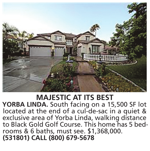 MAJESTIC AT ITS BEST YORBA LINDA. South facing on a 15,500 SF lot located at the end of a cul-de-sac in a quiet & exclusive area of Yorba Linda, walking distance to Black Gold Golf Course. This home has 5 bedrooms & 6 baths, must see. $1,368,000. (531801) CALL (800) 679-5678