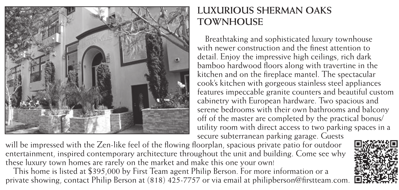 LUXURIOUS SHERMAN OAKS TOWNHOUSE Breathtaking and sophisticated luxury townhouse with newer construction and the fi nest attention to detail. Enjoy the impressive high ceilings, rich dark bamboo hardwood fl oors along with travertine in the kitchen and on the fi replace mantel. The spectacular cook’s kitchen with gorgeous stainless steel appliances features impeccable granite counters and beautiful custom cabinetry with European hardware. Two spacious and serene bedrooms with their own bathrooms and balcony off of the master are completed by the practical bonus/ utility room with direct access to two parking spaces in a secure subterranean parking garage. Guests will be impressed with the Zen-like feel of the fl owing fl oorplan, spacious private patio for outdoor entertainment, inspired contemporary architecture throughout the unit and building. Come see why these luxury town homes are rarely on the market and make this one your own! This home is listed at $395,000 by First Team agent Philip Berson. For more information or a private showing, contact Philip Berson at (818) 425-7757 or via email at philipberson@fi rstteam.com.