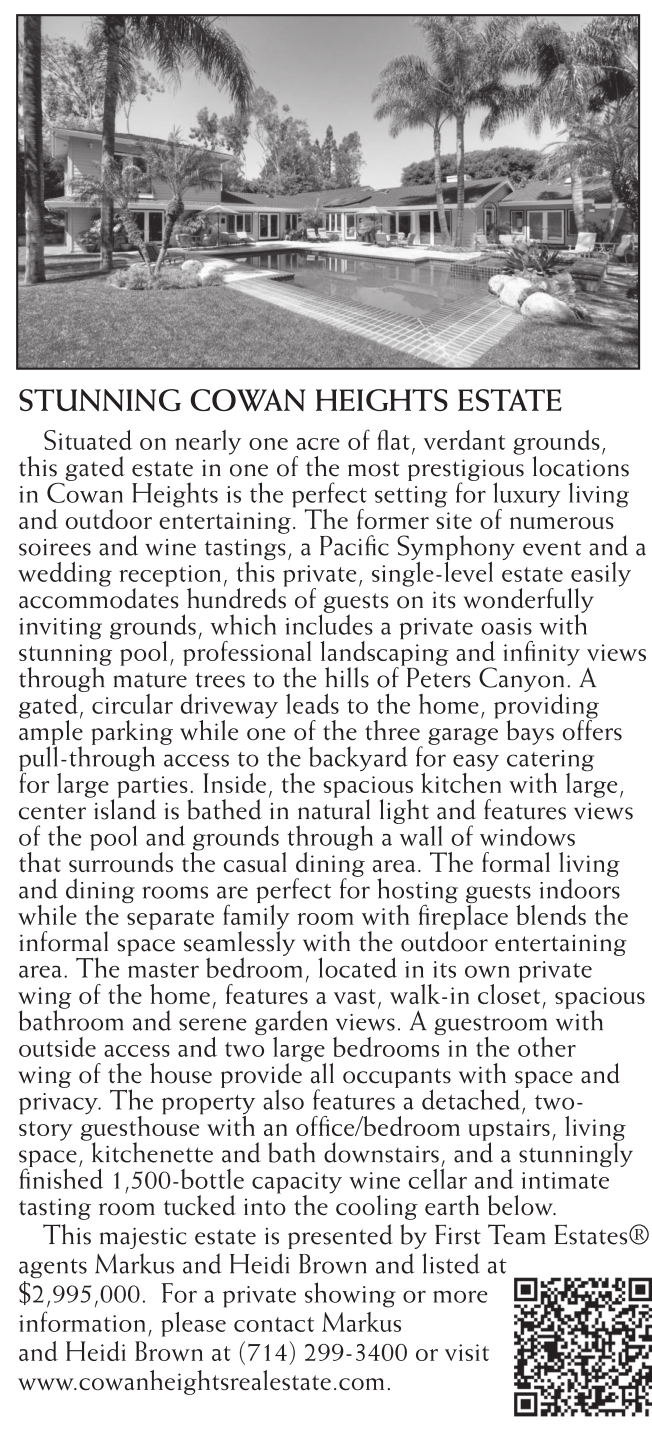 STUNNING COWAN HEIGHTS ESTATE Situated on nearly one acre of flat, verdant grounds, this gated estate in one of the most prestigious locations in Cowan Heights is the perfect setting for luxury living and outdoor entertaining. The former site of numerous soirees and wine tastings, a Pacific Symphony event and a wedding reception, this private, single-level estate easily accommodates hundreds of guests on its wonderfully inviting grounds, which includes a private oasis with stunning pool, professional landscaping and infinity views through mature trees to the hills of Peters Canyon. A gated, circular driveway leads to the home, providing ample parking while one of the three garage bays offers pull-through access to the backyard for easy catering for large parties. Inside, the spacious kitchen with large, center island is bathed in natural light and features views of the pool and grounds through a wall of windows that surrounds the casual dining area. The formal living and dining rooms are perfect for hosting guests indoors while the separate family room with fireplace blends the informal space seamlessly with the outdoor entertaining area. The master bedroom, located in its own private wing of the home, features a vast, walk-in closet, spacious bathroom and serene garden views. A guestroom with outside access and two large bedrooms in the other wing of the house provide all occupants with space and privacy. The property also features a detached, twostory guesthouse with an office/bedroom upstairs, living space, kitchenette and bath downstairs, and a stunningly finished 1,500-bottle capacity wine cellar and intimate tasting room tucked into the cooling earth below. This majestic estate is presented by First Team Estates® agents Markus and Heidi Brown and listed at $2,995,000. For a private showing or more information, please contact Markus and Heidi Brown at (714) 299-3400 or visit www.cowanheightsrealestate.com.