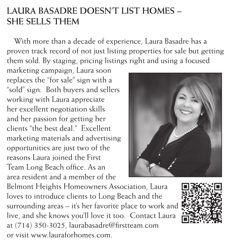 LAURA BASADRE DOESN’T LIST HOMES – SHE SELLS THEM With more than a decade of experience, Laura Basadre has a proven track record of not just listing properties for sale but getting them sold. By staging, pricing listings right and using a focused marketing campaign, Laura soon replaces the “for sale” sign with a “sold” sign. Both buyers and sellers working with Laura appreciate her excellent negotiation skills and her passion for getting her clients “the best deal.” Excellent marketing materials and advertising opportunities are just two of the reasons Laura joined the First Team Long Beach offi ce. As an area resident and a member of the Belmont Heights Homeowners Association, Laura loves to introduce clients to Long Beach and the surrounding areas – it’s her favorite place to work and live, and she knows you’ll love it too. Contact Laura at (714) 350-3025, laurabasadre@fi rstteam.com or visit www.lauraforhomes.com.