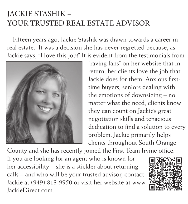 JACKIE STASHIK – YOUR TRUSTED REAL ESTATE ADVISOR Fifteen years ago, Jackie Stashik was drawn towards a career in real estate. It was a decision she has never regretted because, as Jackie says, “I love this job!” It is evident from the testimonials from “raving fans” on her website that in return, her clients love the job that Jackie does for them. Anxious fi rsttime buyers, seniors dealing with the emotions of downsizing – no matter what the need, clients know they can count on Jackie’s great negotiation skills and tenacious dedication to fi nd a solution to every problem. Jackie primarily helps clients throughout South Orange County and she has recently joined the First Team Irvine offi ce. If you are looking for an agent who is known for her accessibility – she is a stickler about returning calls – and who will be your trusted advisor, contact Jackie at (949) 813-9950 or visit her website at www. JackieDirect.com.