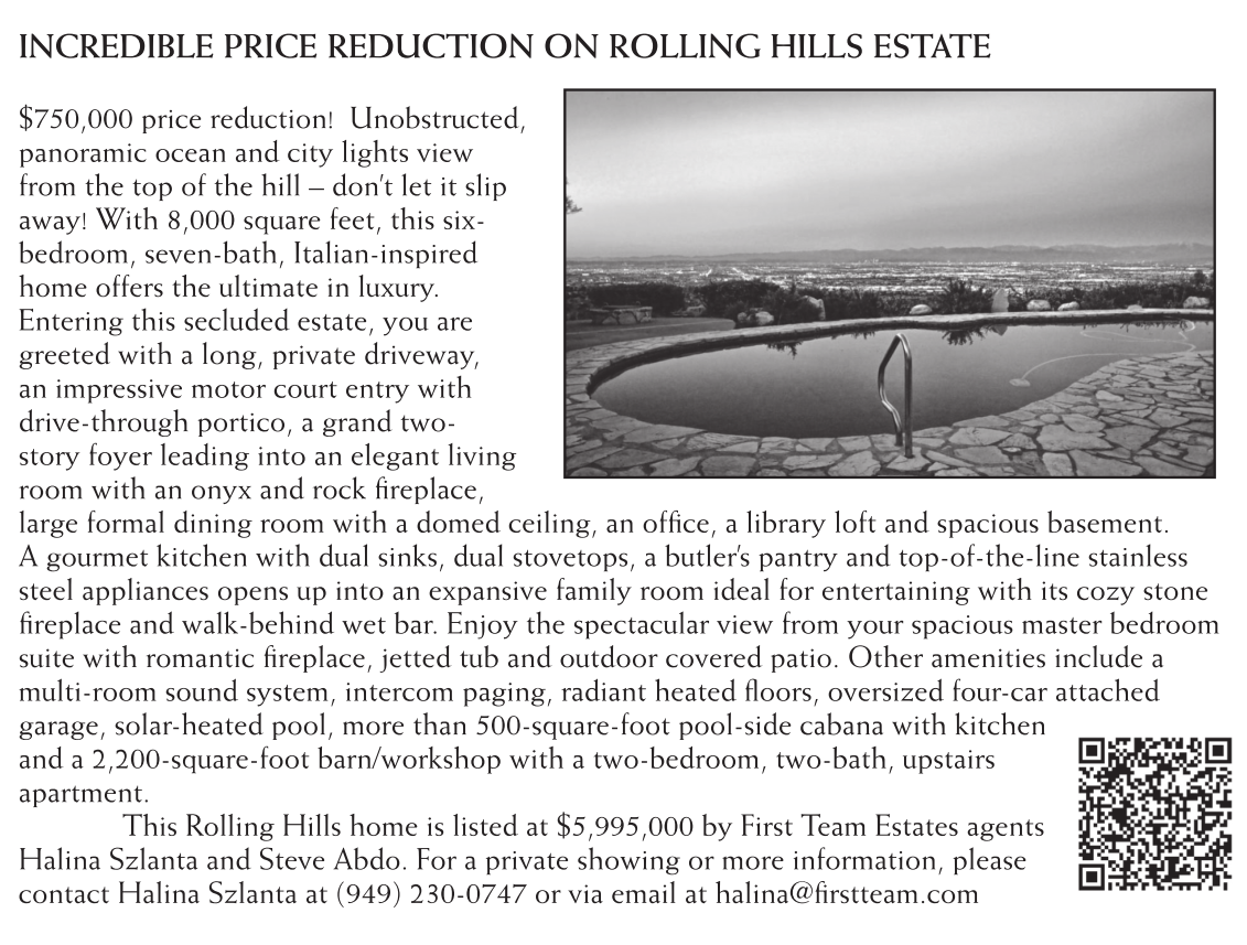 INCREDIBLE PRICE REDUCTION ON ROLLING HILLS ESTATE $750,000 price reduction! Unobstructed, panoramic ocean and city lights view from the top of the hill – don’t let it slip away! With 8,000 square feet, this sixbedroom, seven-bath, Italian-inspired home offers the ultimate in luxury. Entering this secluded estate, you are greeted with a long, private driveway, an impressive motor court entry with drive-through portico, a grand twostory foyer leading into an elegant living room with an onyx and rock fi replace, large formal dining room with a domed ceiling, an offi ce, a library loft and spacious basement. A gourmet kitchen with dual sinks, dual stovetops, a butler’s pantry and top-of-the-line stainless steel appliances opens up into an expansive family room ideal for entertaining with its cozy stone fi replace and walk-behind wet bar. Enjoy the spectacular view from your spacious master bedroom suite with romantic fi replace, jetted tub and outdoor covered patio. Other amenities include a multi-room sound system, intercom paging, radiant heated fl oors, oversized four-car attached garage, solar-heated pool, more than 500-square-foot pool-side cabana with kitchen and a 2,200-square-foot barn/workshop with a two-bedroom, two-bath, upstairs apartment. This Rolling Hills home is listed at $5,995,000 by First Team Estates agents Halina Szlanta and Steve Abdo. For a private showing or more information, please contact Halina Szlanta at (949) 230-0747 or via email at halina@fi rstteam.com