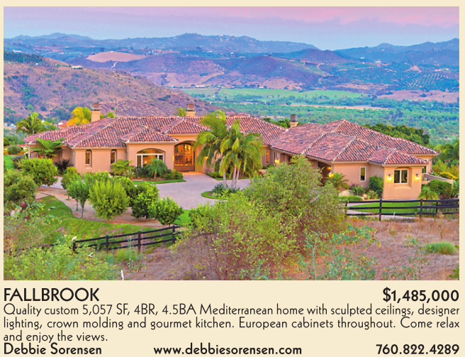 FALLBROOK $1,485,000 Quality custom 5,057 SF, 4BR, 4.5BA Mediterranean home with sculpted ceilings, designer lighting, crown molding and gourmet kitchen. European cabinets throughout. Come relax and enjoy the views. Debbie Sorensen www.debbiesorensen.com 760.822.4289
