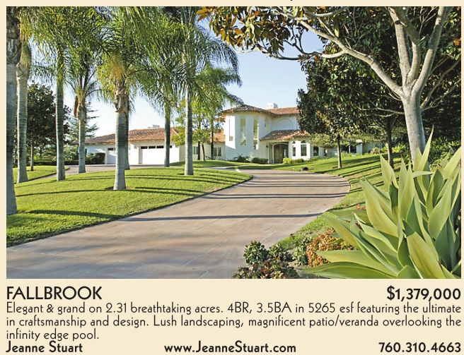 FALLBROOK $1,379,000 Elegant & grand on 2.31 breathtaking acres. 4BR, 3.5BA in 5265 esf featuring the ultimate in craftsmanship and design. Lush landscaping, magnificent patio/veranda overlooking the infinity edge pool. Jeanne Stuart www.JeanneStuart.com 760.310.4663